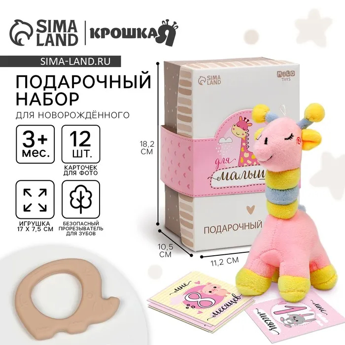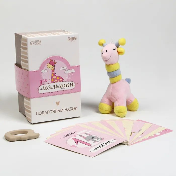 Подарочный набор «Жираф» — это трогательный розовый жирафик, прорезыватель и карточки для памятных фото. Набор в красивой коробке станет первым другом ребёнка и поможет в развитии с первых месяцев.