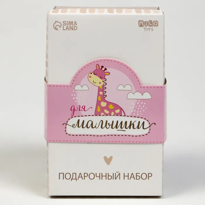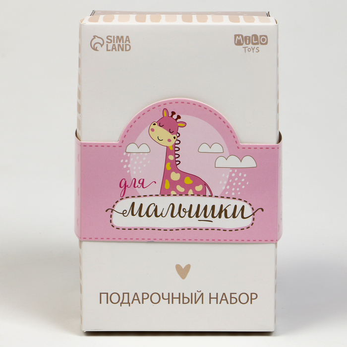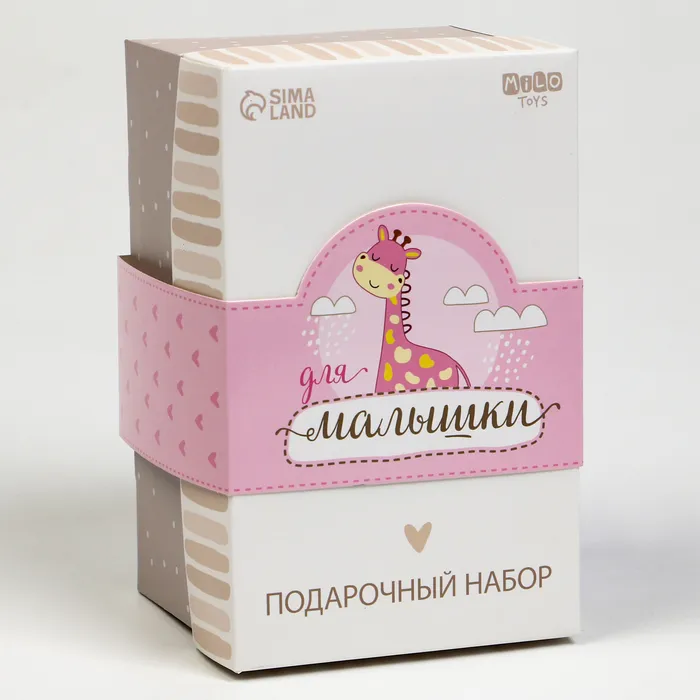 Подарочный набор «Жираф» подойдёт для девочки с 3 месяцев. Коробка с милым жирафиком создаёт праздничное настроение. Игрушка развивает тактильное восприятие, а прорезыватель облегчает дискомфорт при росте зубов. Это тот случай, когда подарок красивый, полезный и надолго остаётся в памяти.