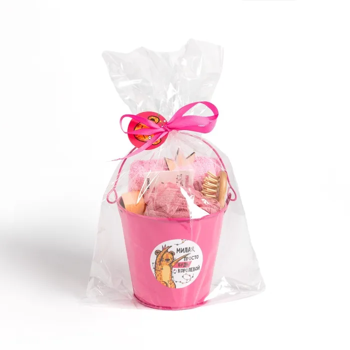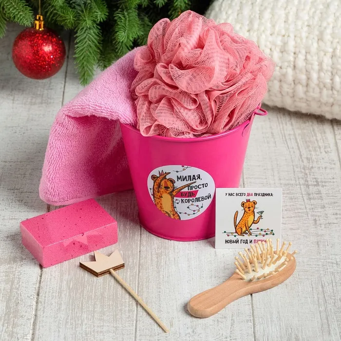 В состав набора входят: Ведёрко, Декор, Мочалка, Открытка, Пемза, Полотенце, Расчёска.