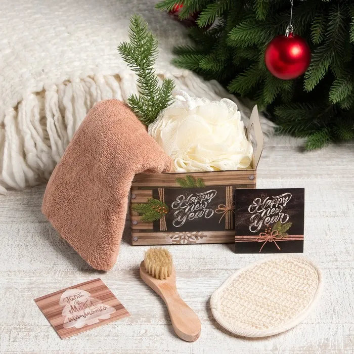 В состав набора входят: Варежка-мочалка, Декор, Мочалка, Открытка, Полотенце, Щётка