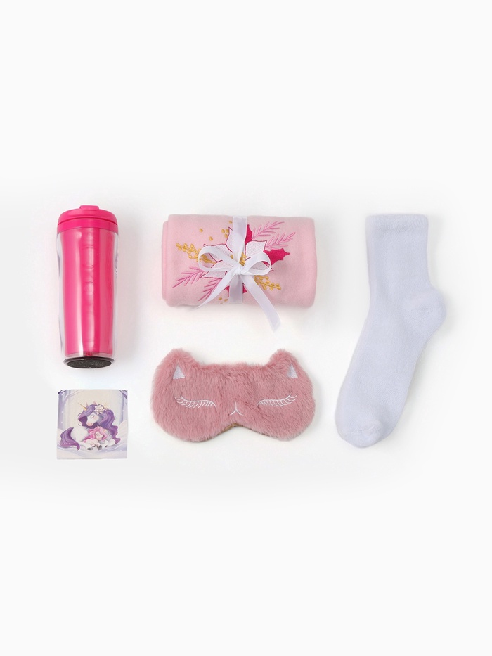 - В наборе — 5 предметов: плед, маска для сна, носки, термостакан и поздравительная открытка.
