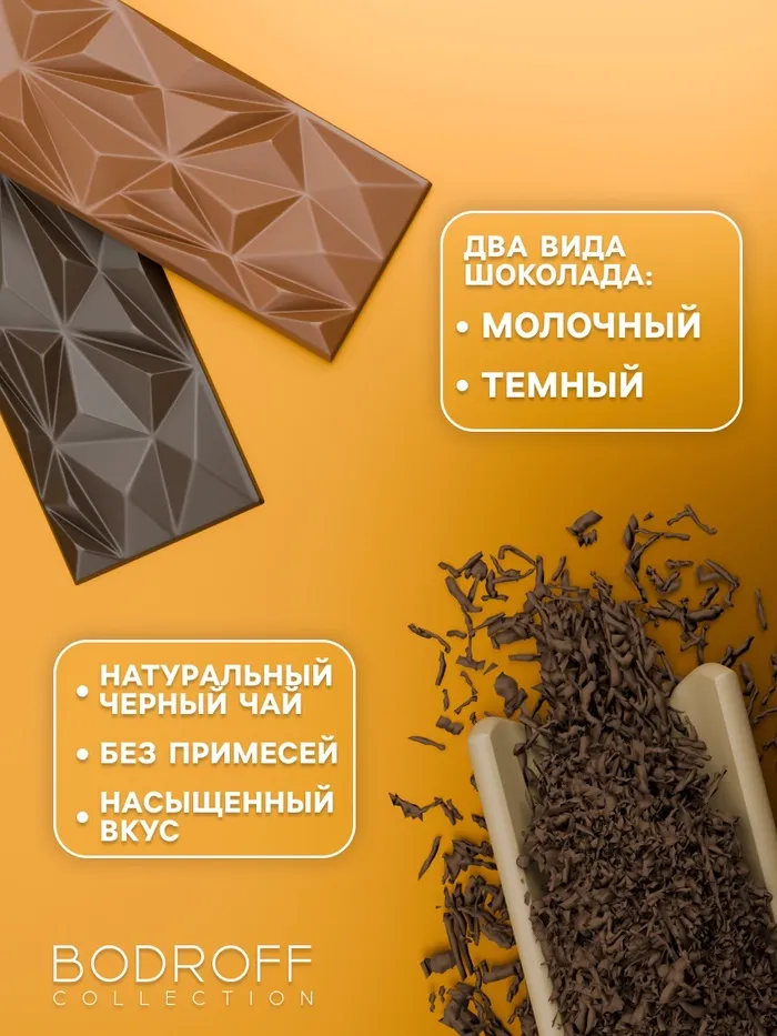 • В наборе: чёрный чай без добавок, темный и молодный шоколад.