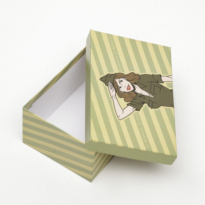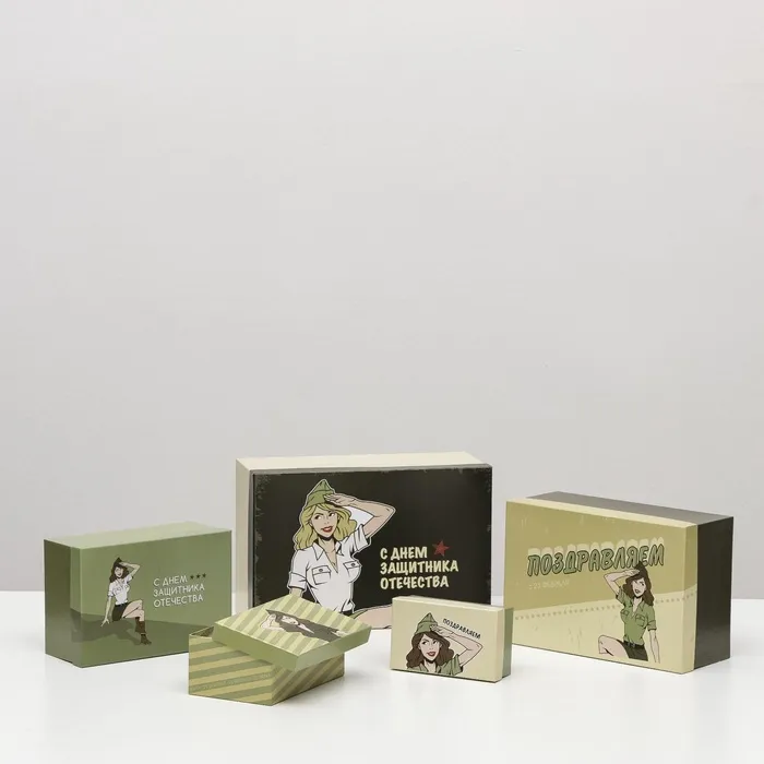 - Камуфляжный дизайн: Коробки оформлены в стильном и актуальном камуфляжном принте, что подчеркнет и удвоит атмосферу праздника 23 февраля. Ваш подарок будет выглядеть солидно и представительно.