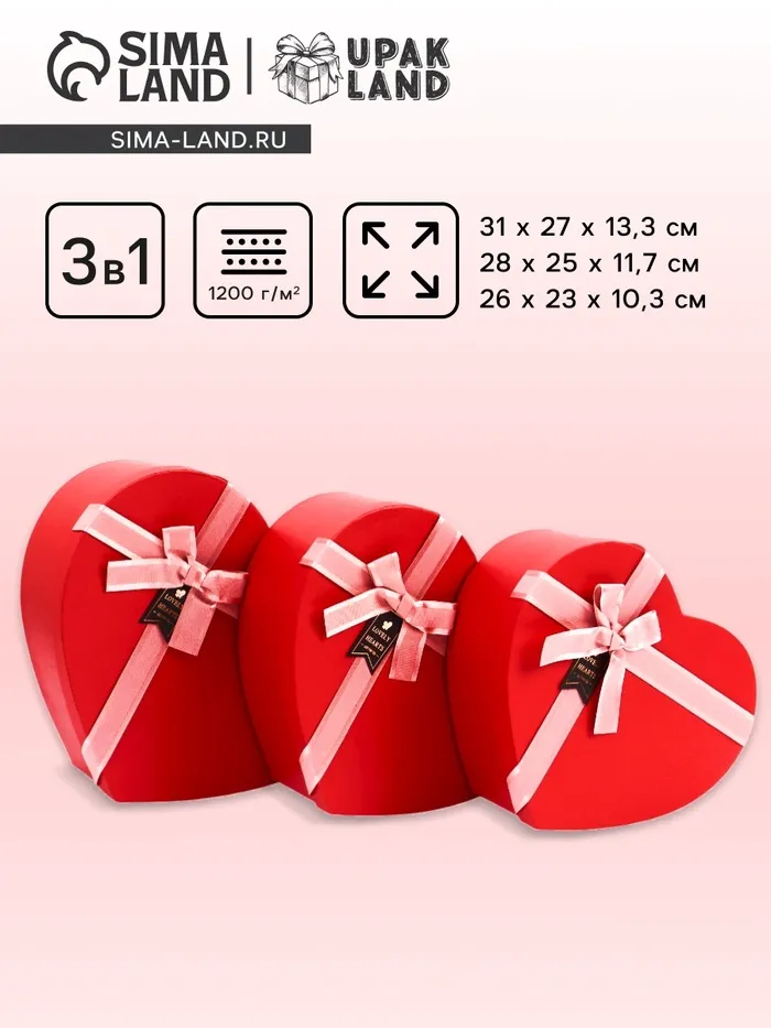 Набор подарочных коробок сердце 3 в 1, красный с розовым бантом, 31×27×13.3; 28×25×11.7; 26×23×10.3 см — Характеристики