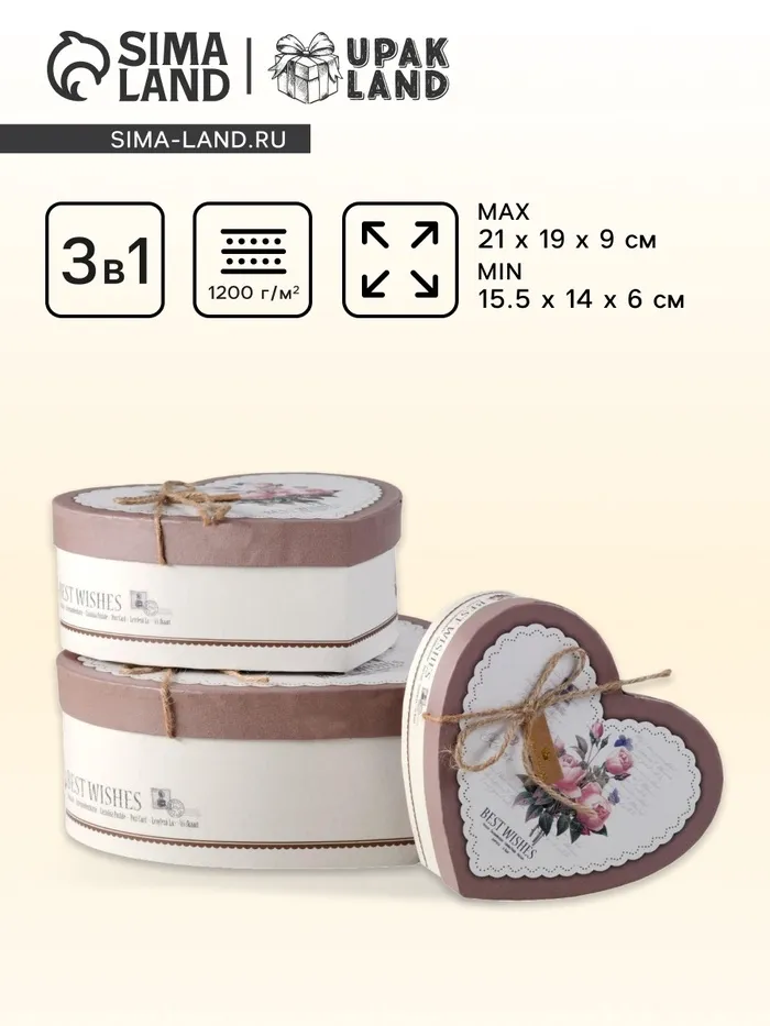 Набор подарочных коробок сердце 3 в 1, «Пионы» коричневый, 21×19×9 - 15.5×14×6 см — Характеристики