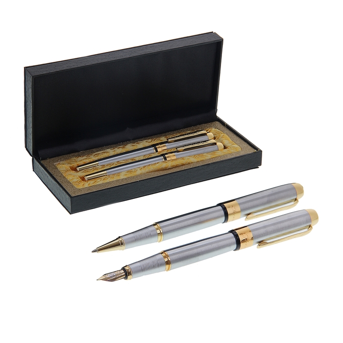 Шариковая и капилярная подарочные ручки в пластиковом футляре "Платина", серебро с золотом – продемонстрирует ваш безупречный вкус и подчеркнёт статус своего обладателя. Обтекаемый металлический корпус декорирован блестящими деталями. Приобрести эти качественные и надёжные ручки в пластиковом футляре можно оптом по очень привлекательной цене.