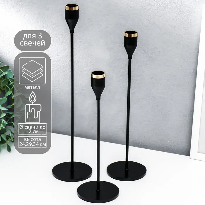 Набор подсвечников на 1 свечу «Классика», 3 шт., чёрный, 24×8×8 см, 29×8×8 см, 34×8×8 см — Характеристики