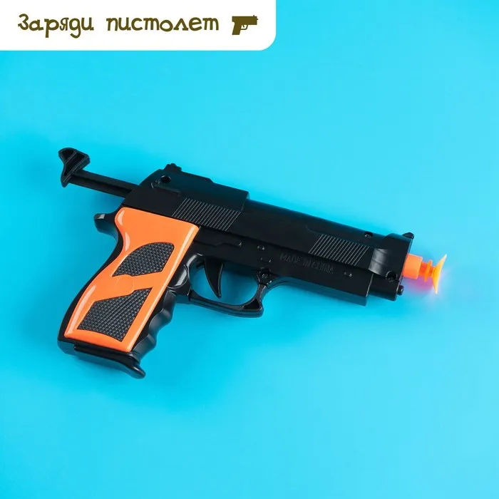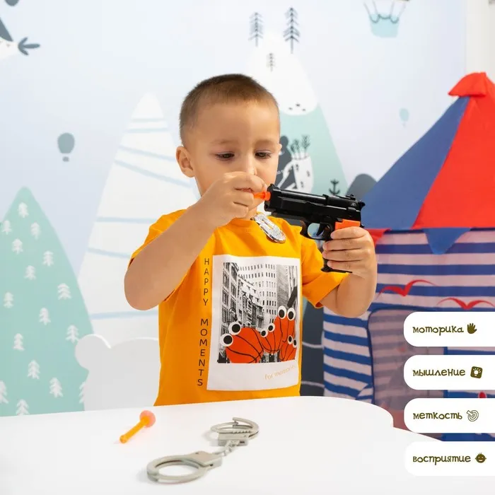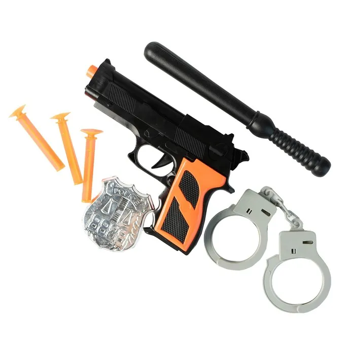 - В комплект входят: пистолет, дубинка, наручники, значок, стрелы с присосками и другие аксессуары.