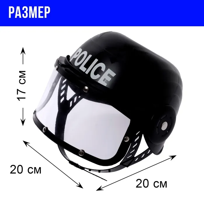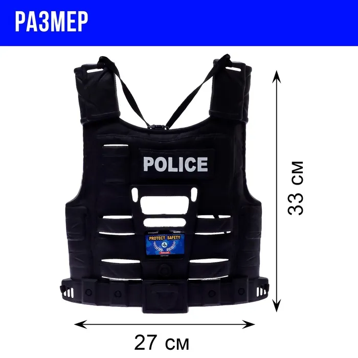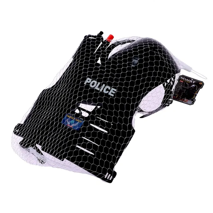 - В комплект входят: автомат-трещотка, защитный шлем и полицейский жилет.