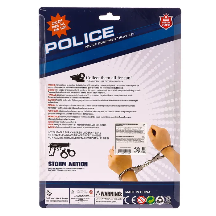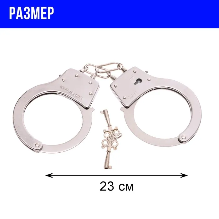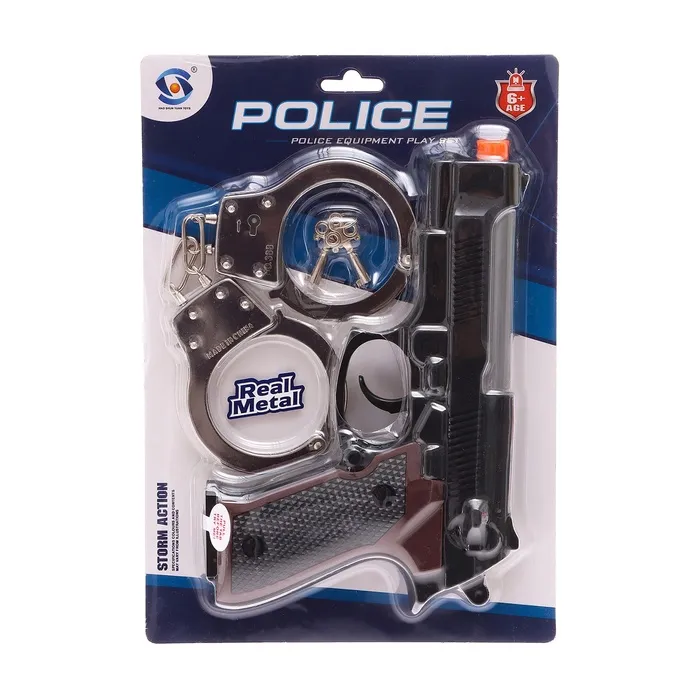 - В комплекте: пистолет с световыми и звуковыми эффектами и металлические наручники с ключами.