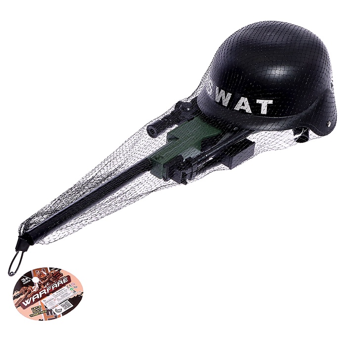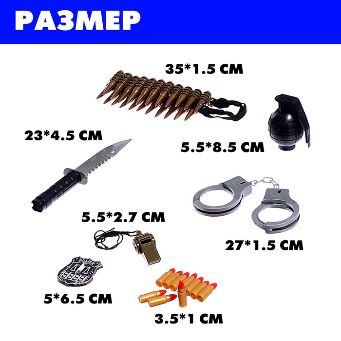 - В комплект входят: снайперская винтовка со световыми и звуковыми эффектами, шлем, нож, наручники, граната, патроны, свисток, значок и очки.