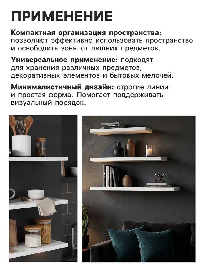 Функциональный набор из трёх настенных полок — решение для организации пространства в современном интерьере. Лаконичный минималистичный дизайн позволяет использовать полки как декоративный элемент или полноценную систему хранения. За счёт разных размеров каждая полка выполняет свою задачу: от размещения небольших предметов до хранения более габаритных вещей.