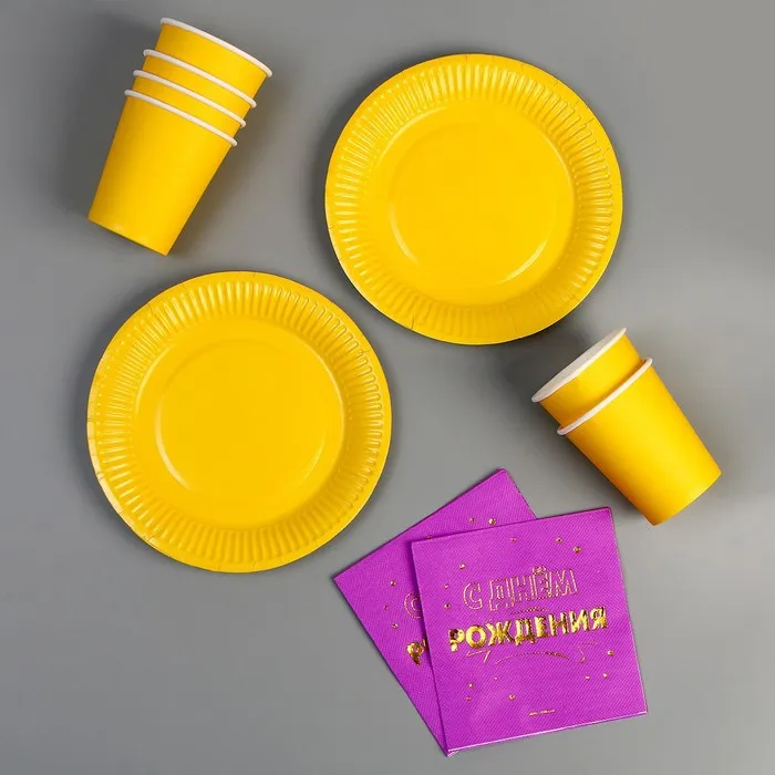 Набор посуды «С днём рождения»: салфетки 20 шт., стаканы 6 шт., тарелки 6 шт., золото — Характеристики