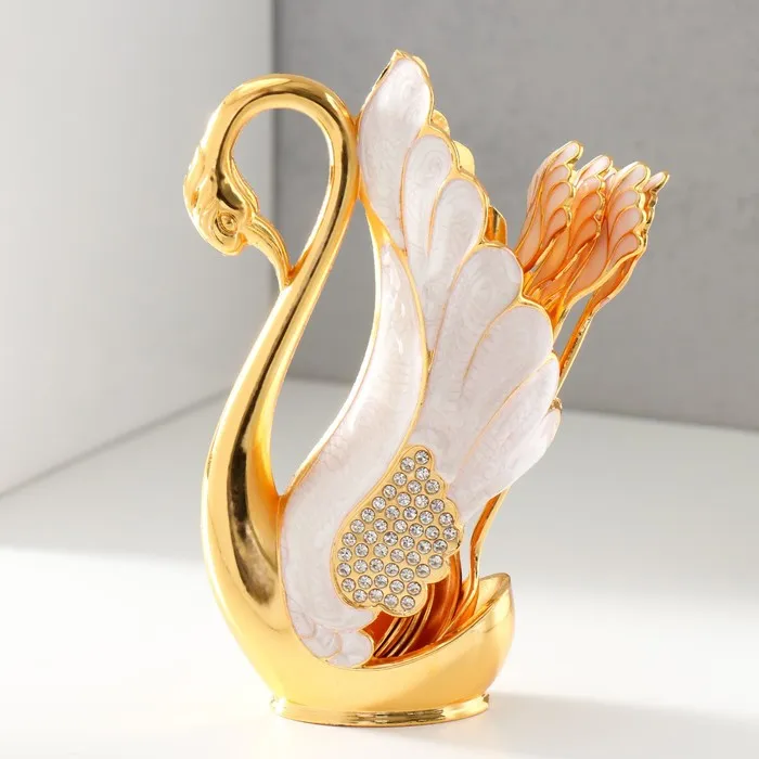 Представляем изысканный набор, который станет настоящим украшением вашего стола и вдохновит на создание особой атмосферы уюта. Шесть ложек, выполненных в виде элегантных перьев, словно сошедших с картины художника, поражают своей детализированностью и гармоничным сочетанием белого и золотистого оттенков. Подставка в форме роскошного розового лебедя, украшенная сверкающими стразами, завершает композицию, превращая этот предмет в произведение искусства.