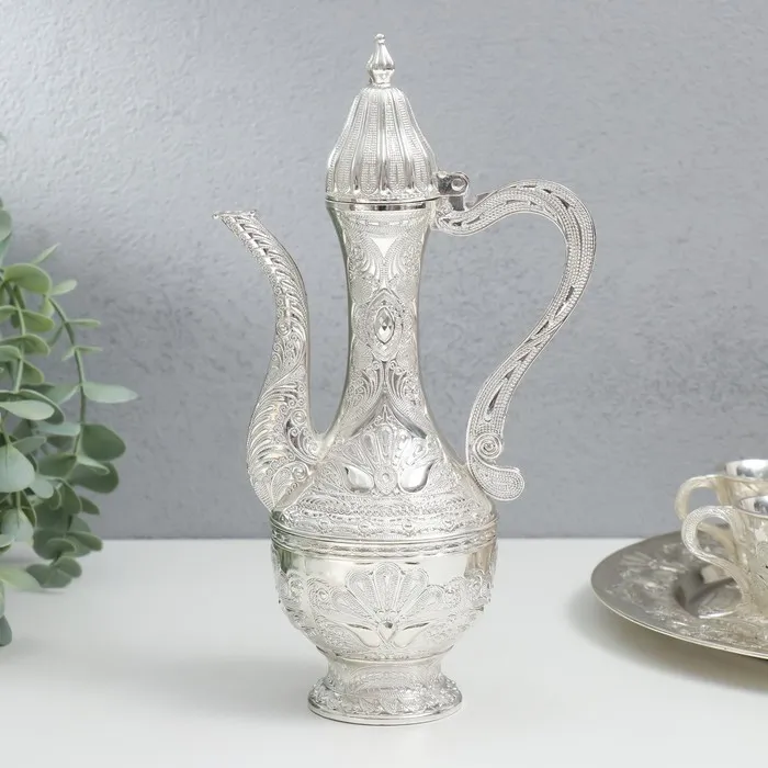 Набор отличается тщательной проработкой деталей: сложные орнаментальные узоры, вдохновленные восточной эстетикой, гармонично сочетаются с классической формой предметов. Высота кувшина делает его удобным для использования, а также элегантным дополнением сервировки. Поднос, изготовленный из металла, завершает композицию, предлагая практичное решение для подачи напитков.