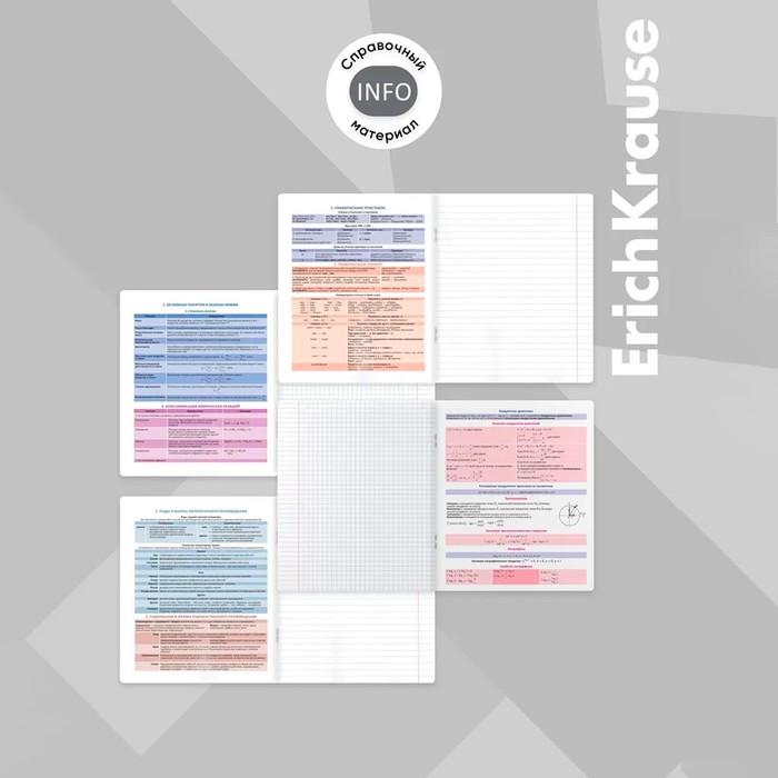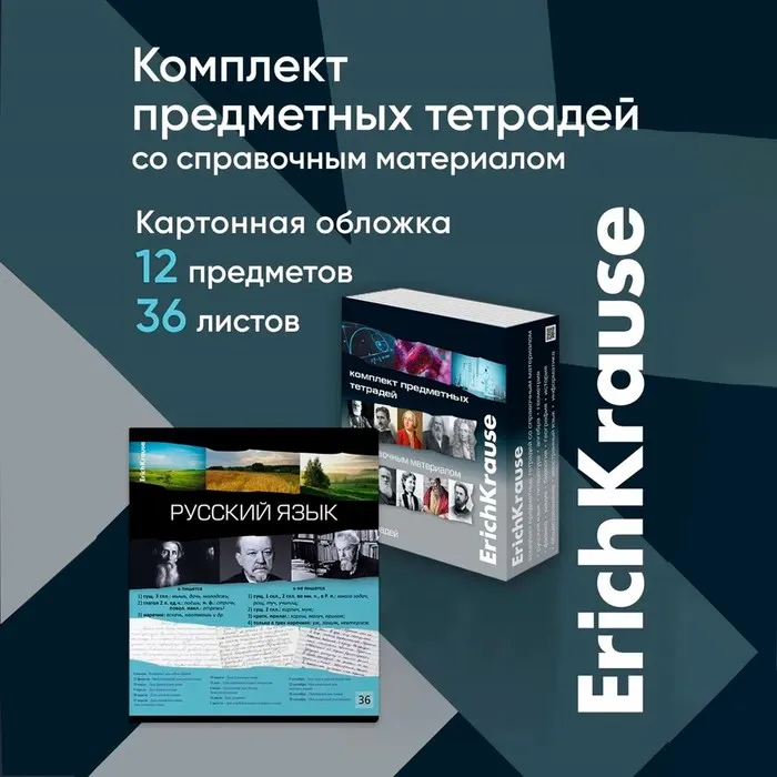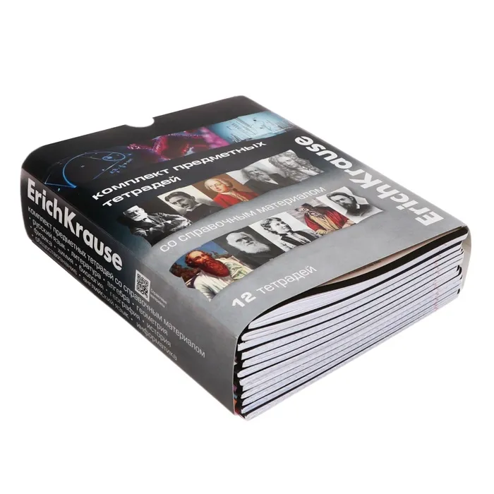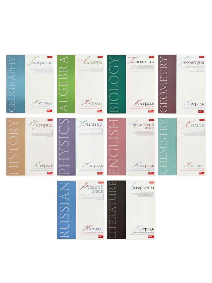Комплект тетрадей по 12 основным учебным предметам: русский язык, литература, алгебра, геометрия, физика, химия, биология, география, история, обществознание, английский язык, информатика. Удобный вариант для приобретения на целый учебный год или в подарок. Каждая тетрадь объемом 36 листов имеет инфо-блок на 2 страницы с кратким изложением школьной программы. Упаковка - картонная обечайка в термоусадочной пленке.