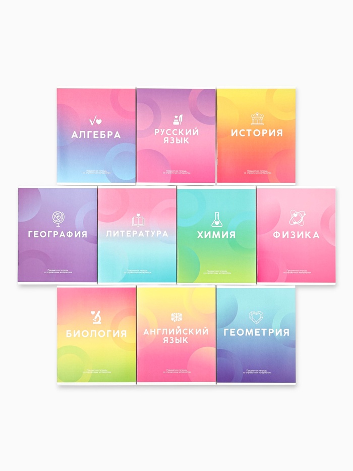 - В комплект входит 10 предметов: алгебра, английский язык, биология, география, геометрия, история, литература, русский язык, физика, химия