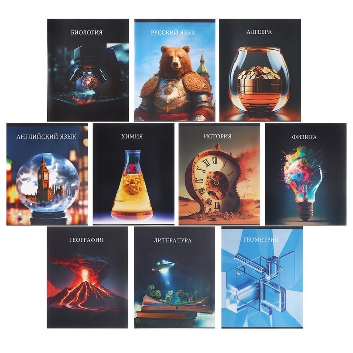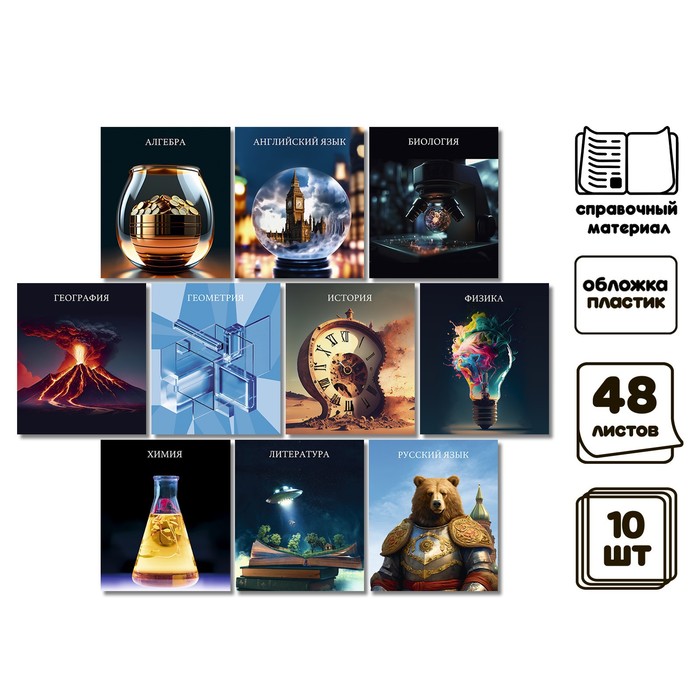 - В комплект входит 10 предметов: алгебра, английский язык, биология, география, геометрия, история, литература, русский язык, физика, химия