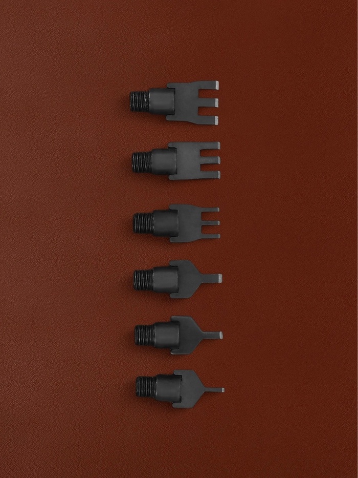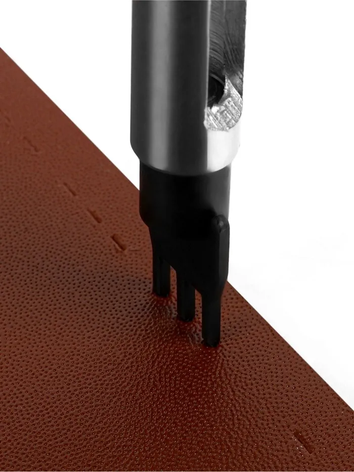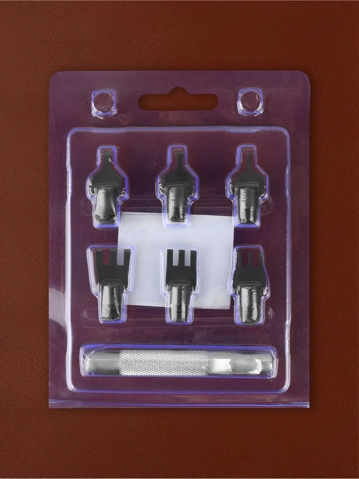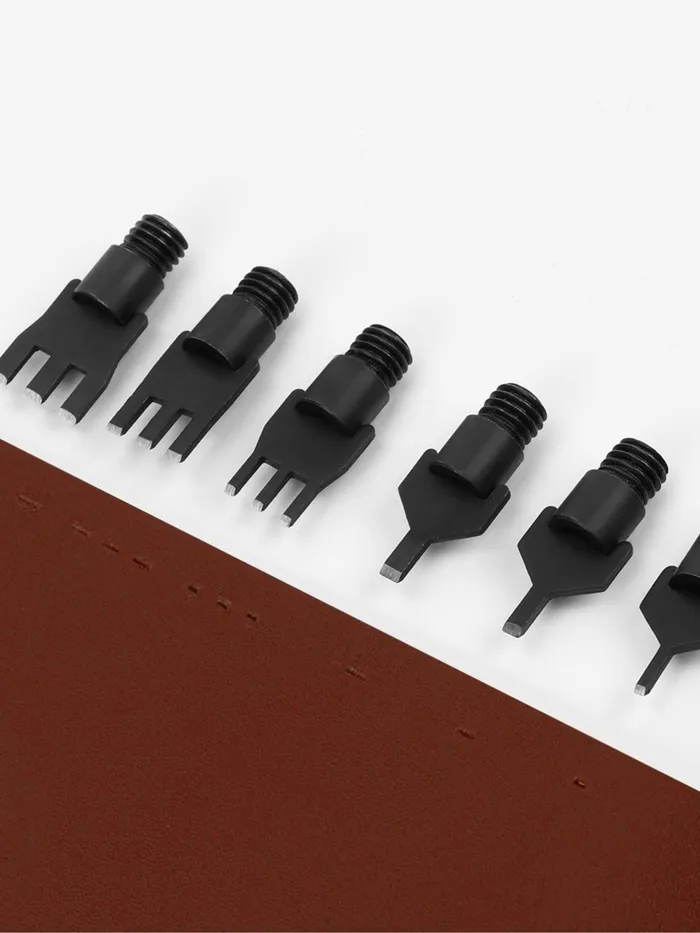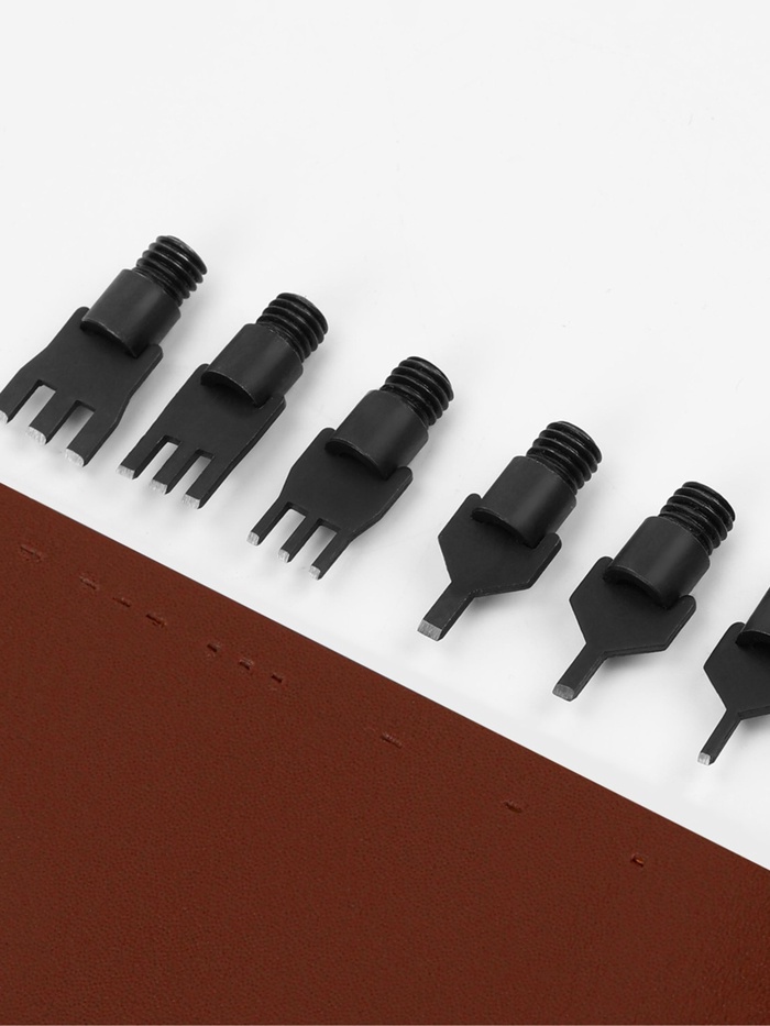Создавайте уникальные элементы для кожаных изделий с помощью набора, который объединяет семь инструментов для профессиональной обработки материала. Этот комплект включает шесть сменных насадок и одну основу, что делает его универсальным решением для мастеров всех уровней.