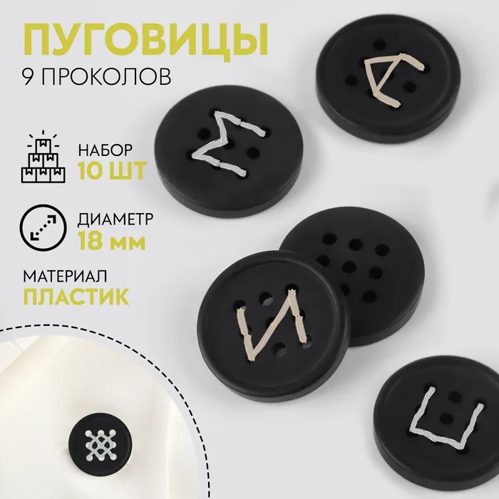 Набор пуговиц, 9 проколов, d=18 мм, 10 шт., чёрный — Характеристики
