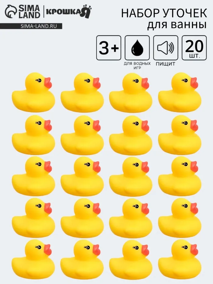 - 20 штук в комплекте: большой запас для игр в ванной, домашнего бассейна и водных развлечений на даче; удобно делить между детьми и брать несколько уточек с собой в дорогу.