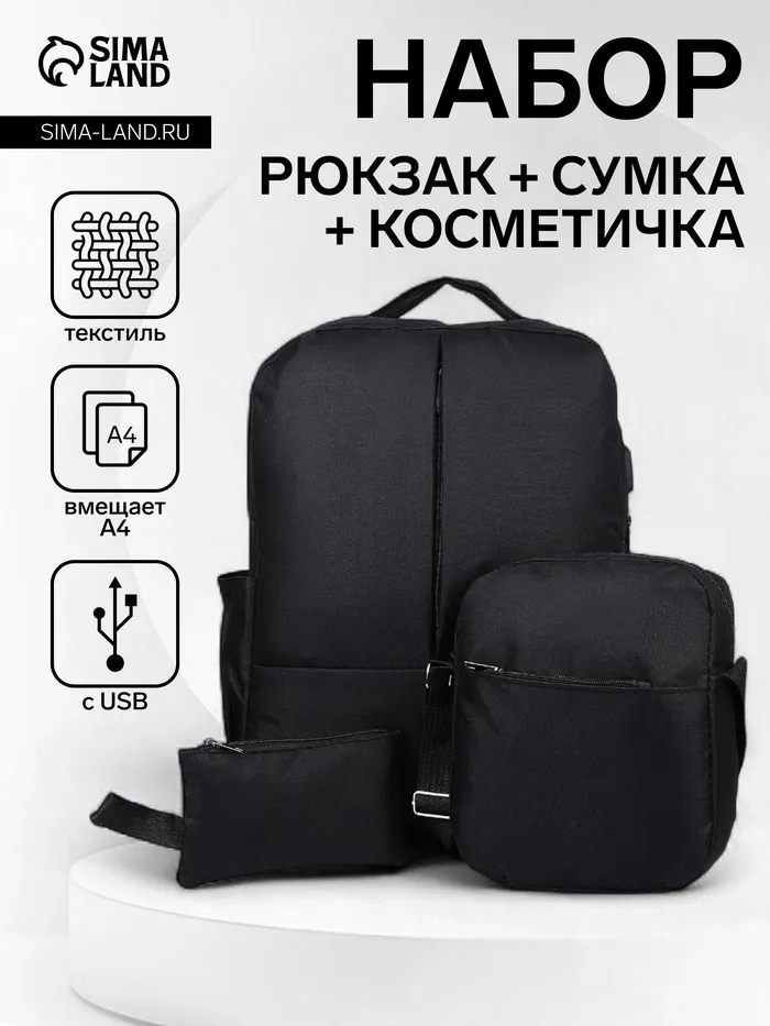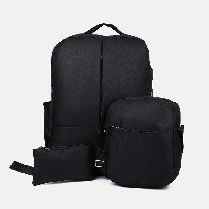 Набор рюкзак мужской на молнии с USB, наружный карман, косметичка, сумка, цвет чёрный — Характеристики