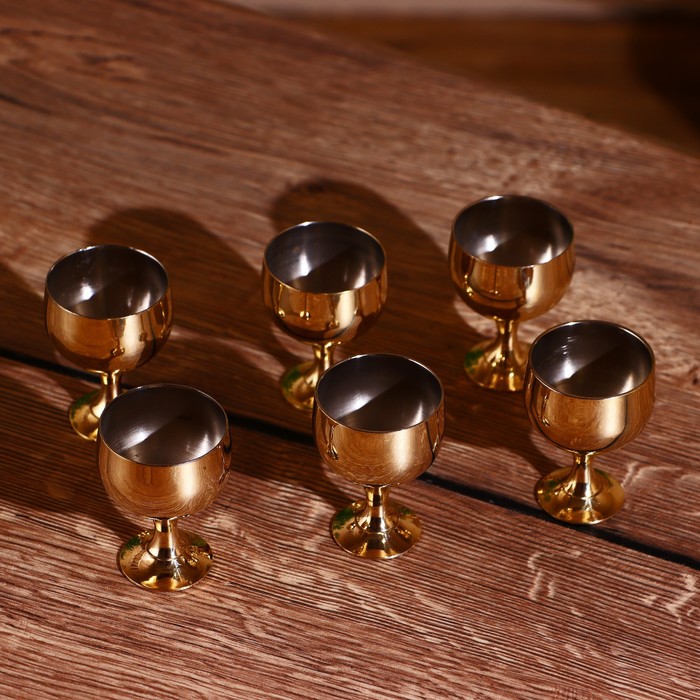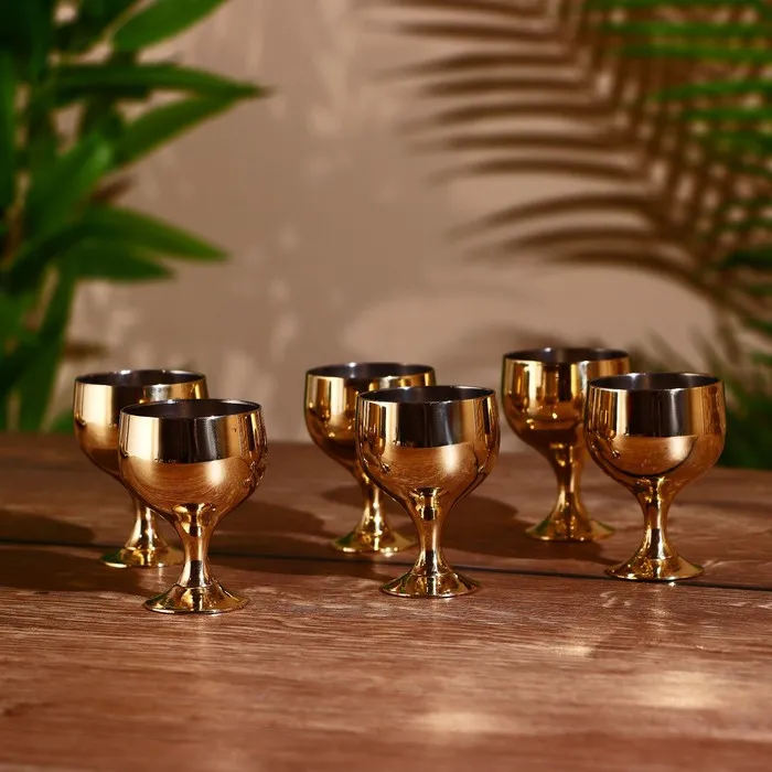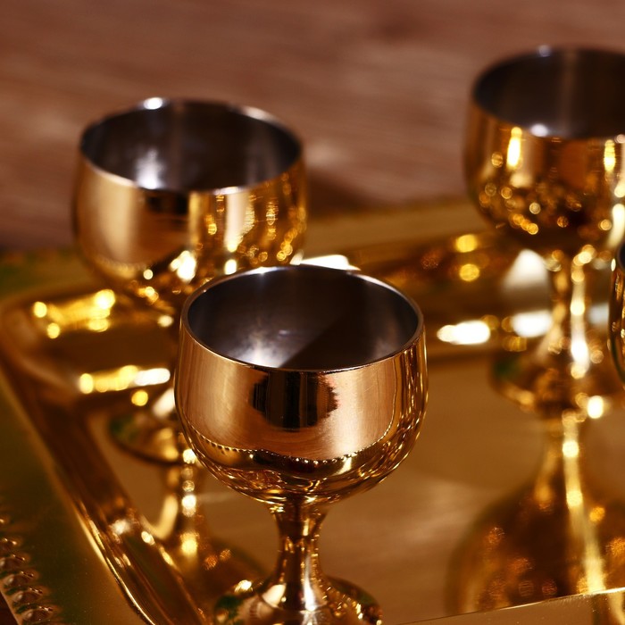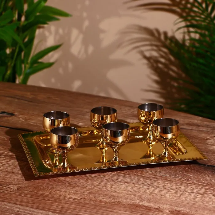 Набор золотистых рюмок на подносе — разумный выбор для ценителей удобства и качества. Комплект из 6 предметов с подносом, надёжные материалы и лаконичный дизайн — всё для комфортного использования.