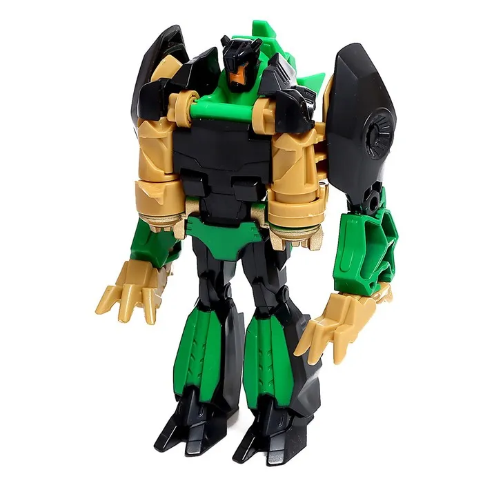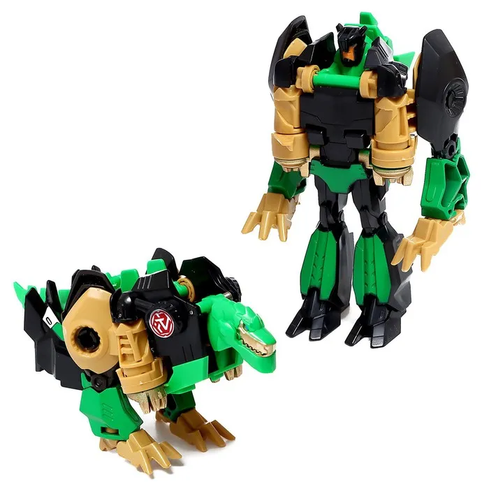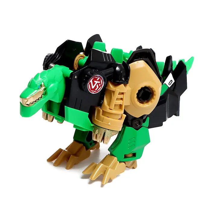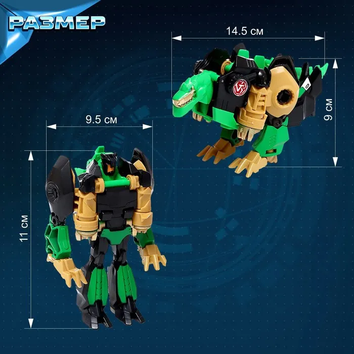 - Размер зелёного робота: 9,5 × 6 × 11 см. В виде динозавра: 14,5 × 5,5 × 9 см.
