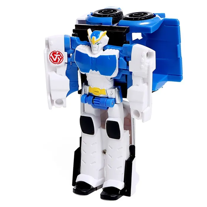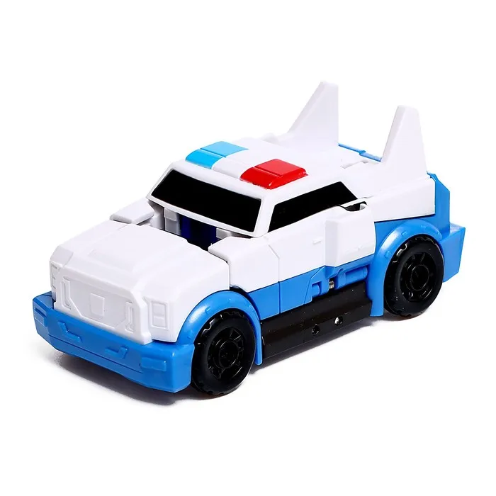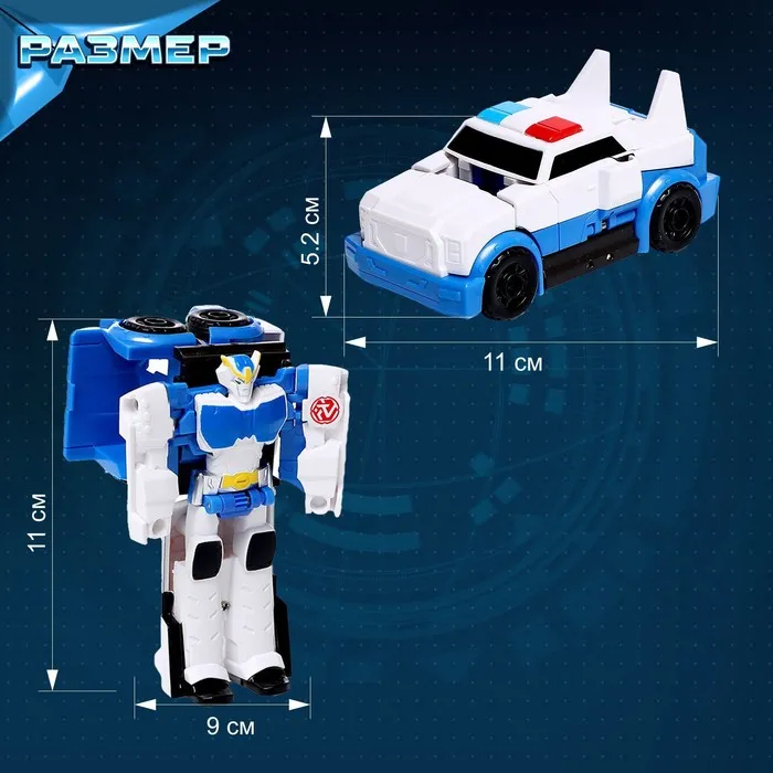 - Размер бело-синего робота: 9 × 5 × 11 см. В виде машинки: 11 × 5 × 5,2 см.