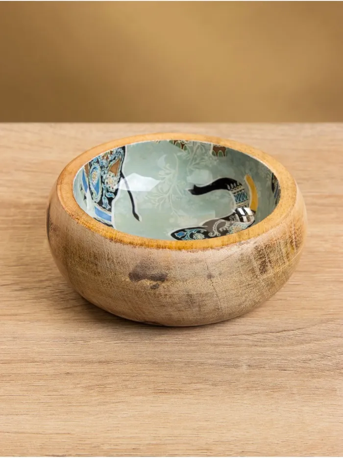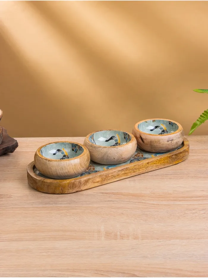 Набор розеток на подносе «Мудрый слон» — это три стильные и утилитарные чаши, выполненные из мангового дерева. Уникальность каждого набора достигается за счет ручной росписи с мотивами животного мира, придающей изделиям колоритный бежево-разноцветный оттенок. Розетки круглой формы идеально подходят для подачи варенья, соусов, мёда или специй. Не предназначены для использования в посудомоечной машине или СВЧ-печи.