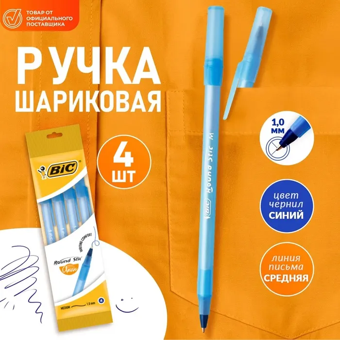 Набор ручек шариковых 4 штуки BIC "Round Stic Classic", узел 1.0 мм, среднее письмо, синие чернила — Характеристики