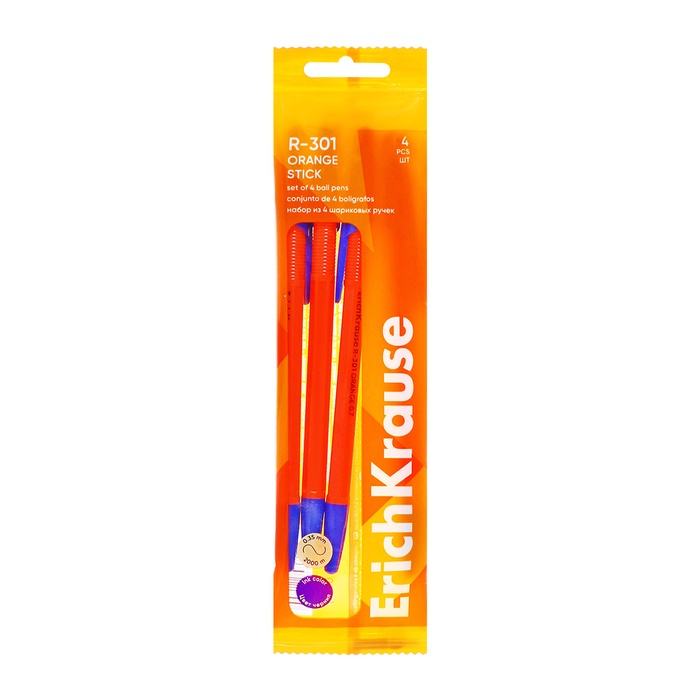 Набор ручек шариковых 4 штуки ErichKrause R-301 orange, узел 0.7 мм, чернила синие, длина линии письма 2000 метров, европодвес — Характеристики