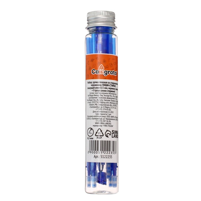 Набор ручка гелевая со стираемыми чернилами, пишущий узел 0.5 мм, чернила синие+9 синих стержней — Характеристики