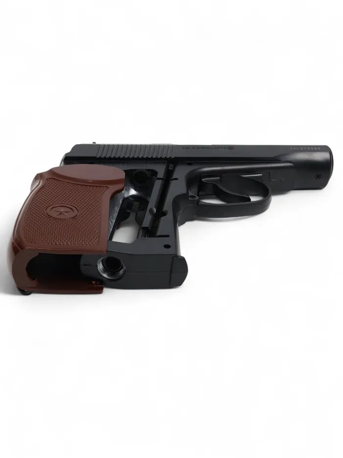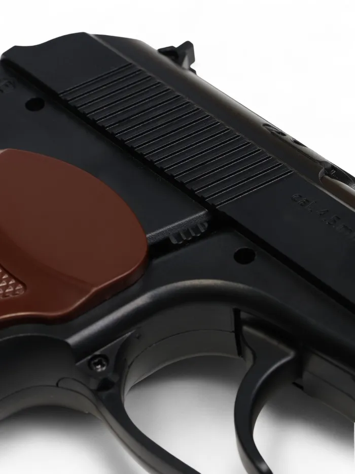 Материал – ударопрочный полимер. Длина пистолета, как и у прототипа, составляет 16 см, а вес всего 0,27 кг, что дает возможность использовать такое оружие даже подросткам. За счет отсутствия подвижных элементов данная модификация отличается прочностью и долговечность. В комплектации – паспорт и инструкция пользователя.