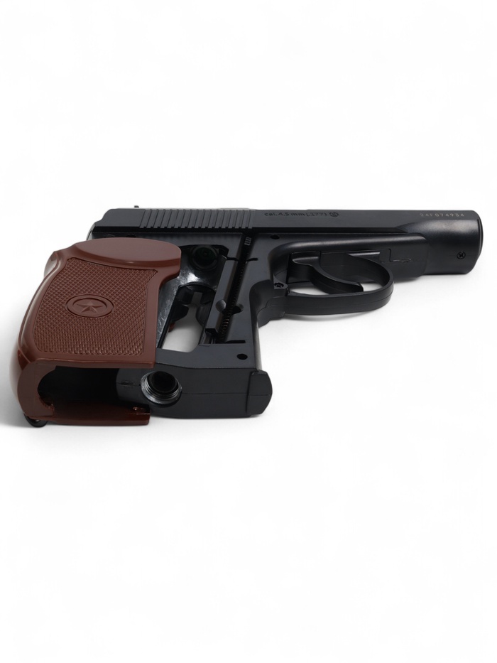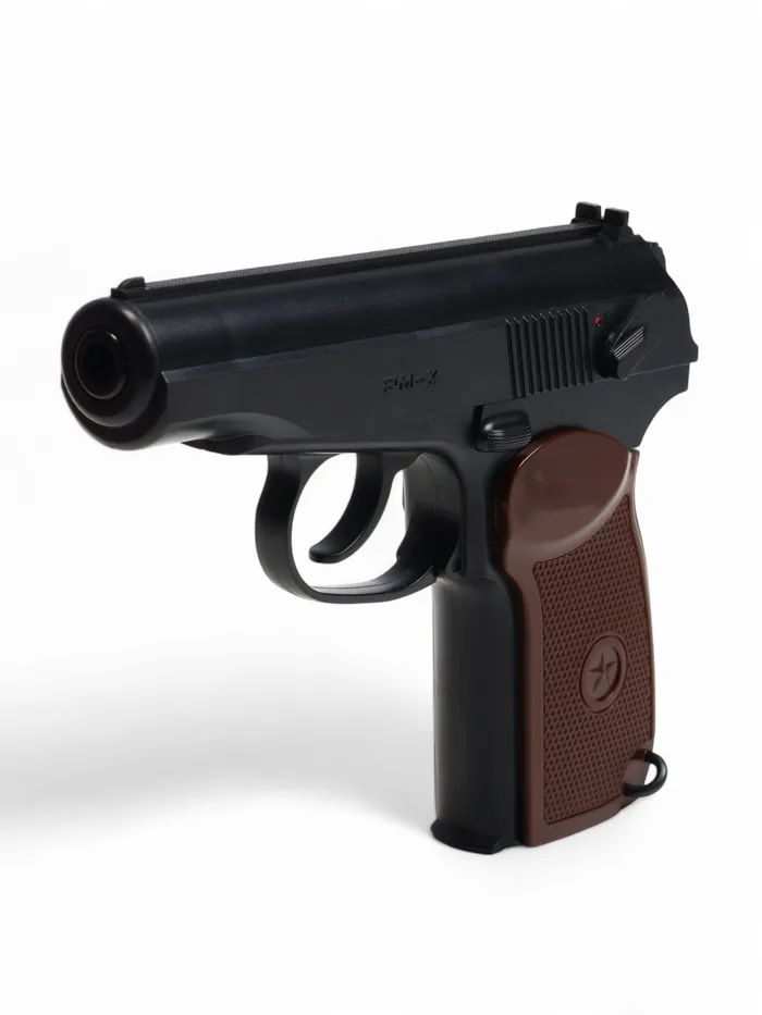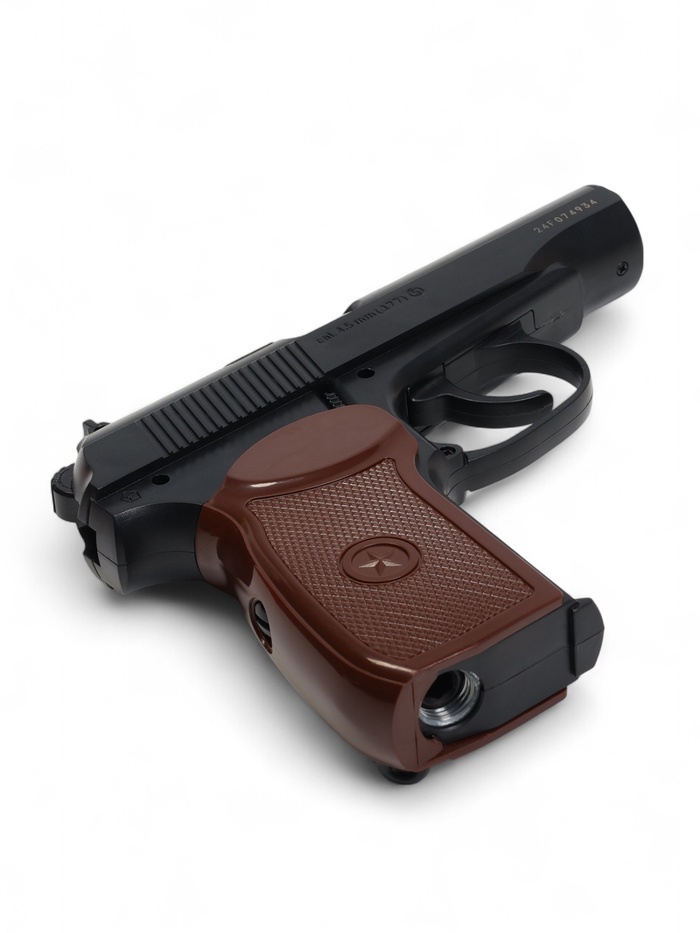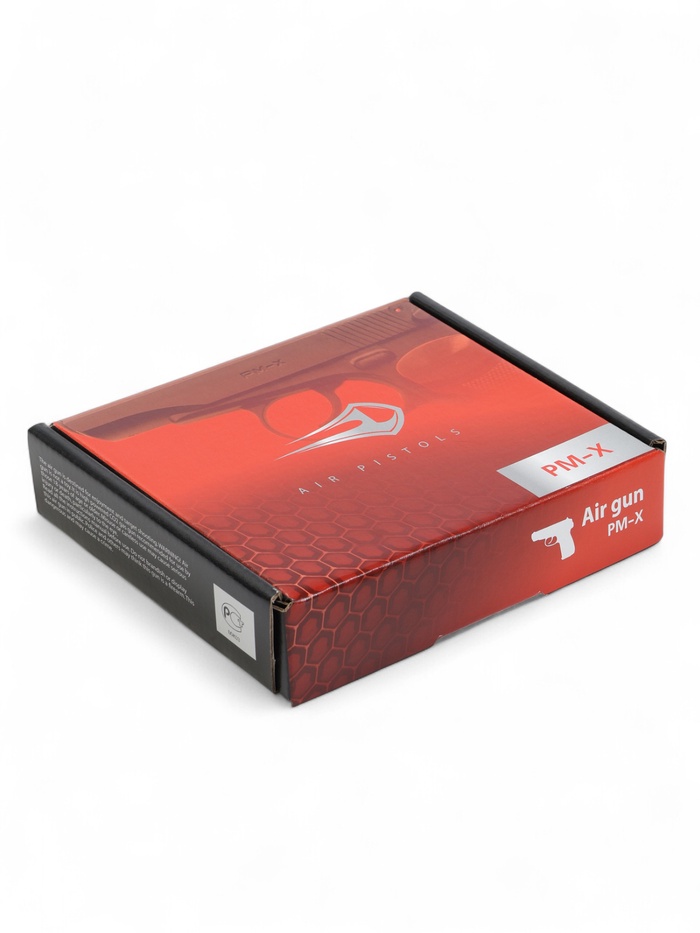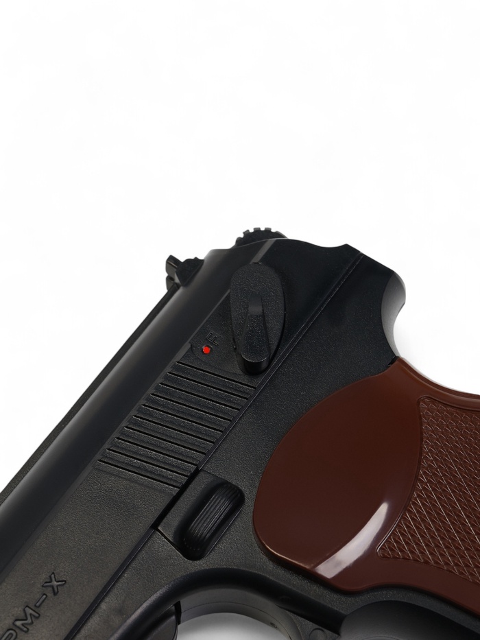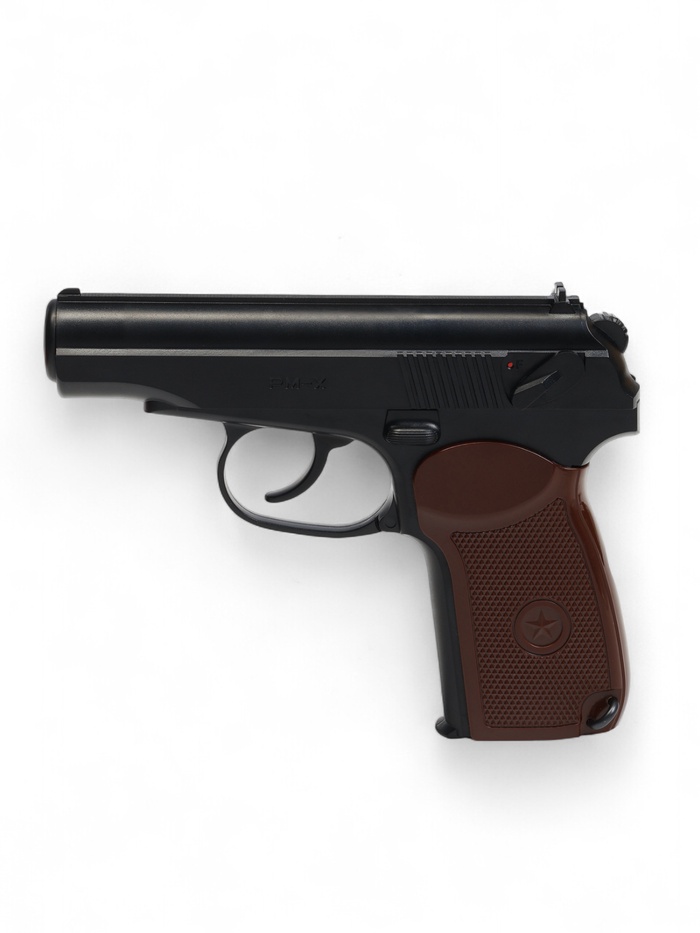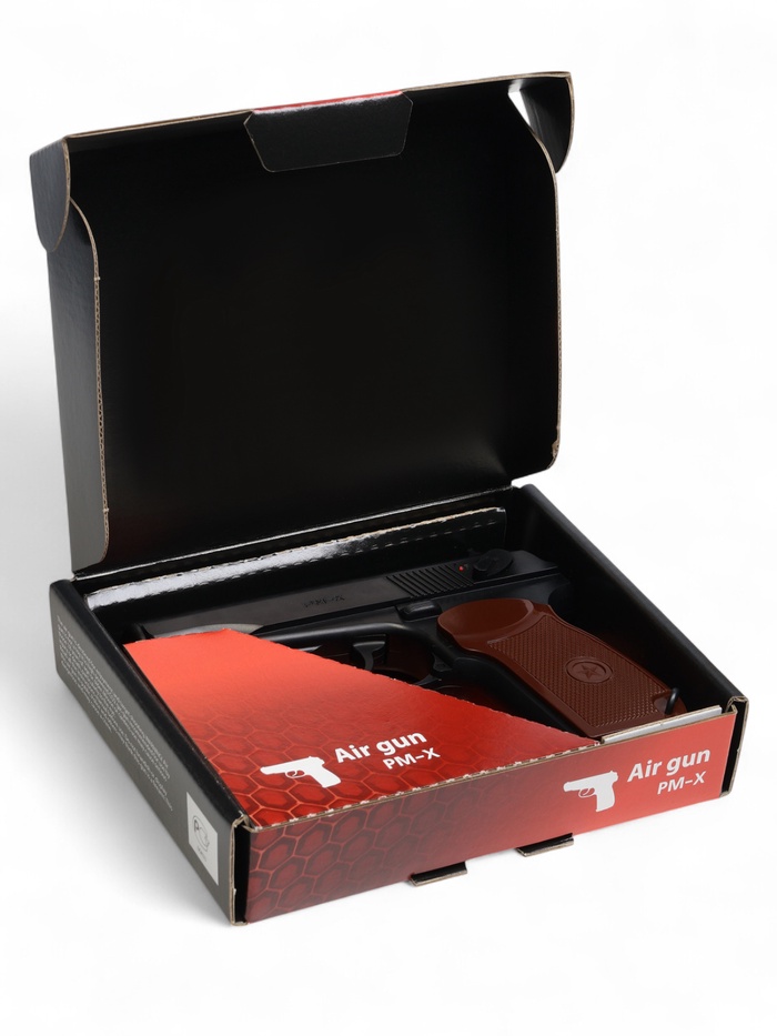На вылете пуля набирает скорость до 100 м/с, при этом показатель дульной энергии пистолета Borner PM-X не превышает 3 Дж, поэтому приобрести его могут все желающие, без необходимости оформления разрешений и лицензий. Внешний вид пистолета также соответствует боевому прототипу в его классическом исполнении – корпус окрашен в черный цвет, на рукоятке пластиковая коричневая накладка с рифлением и пятиконечной звездой в центре.