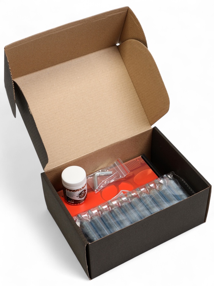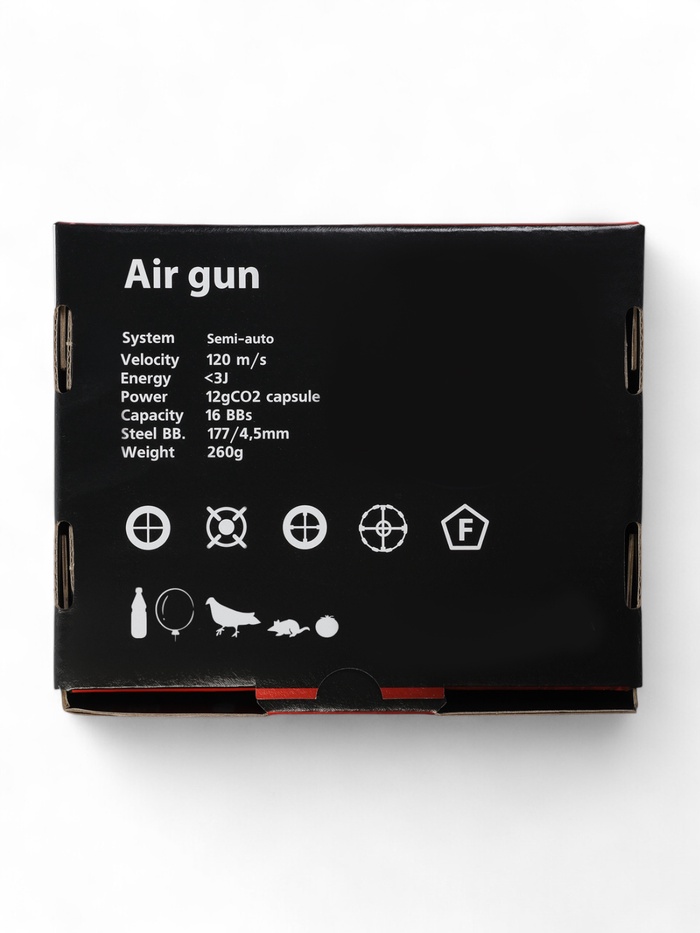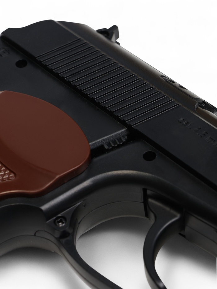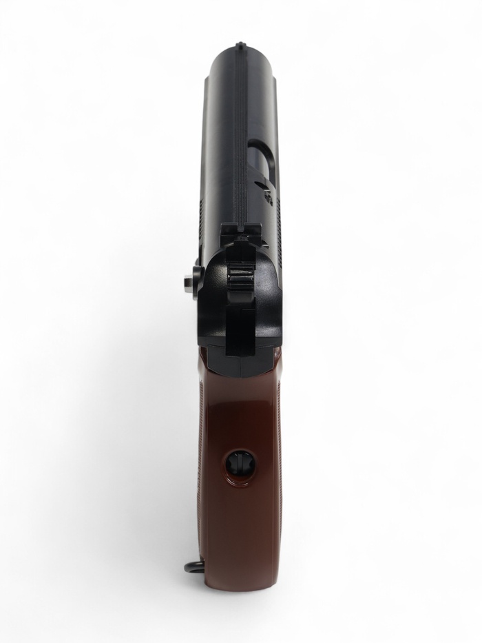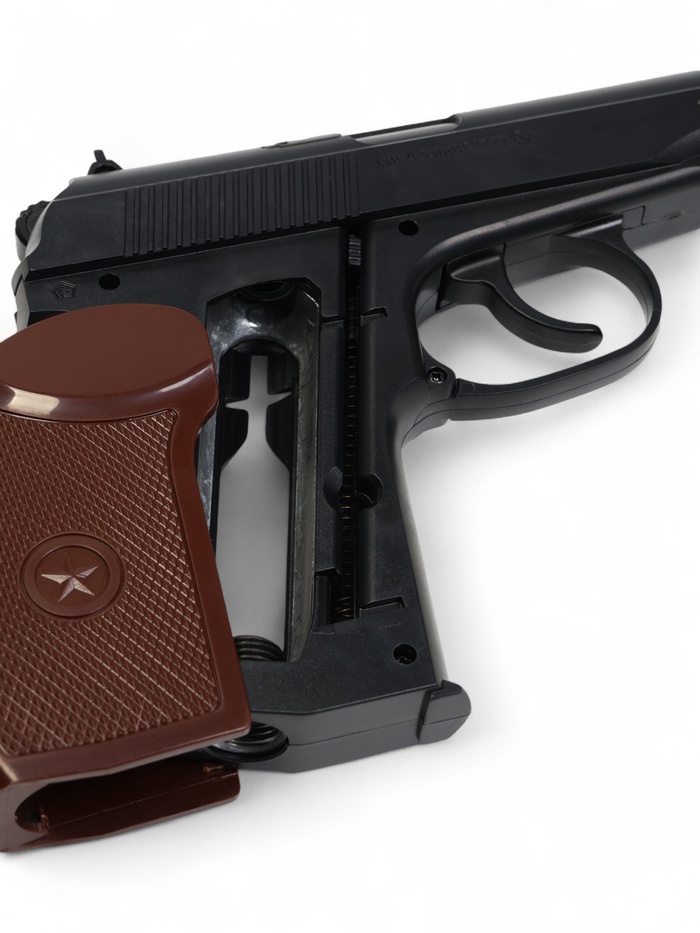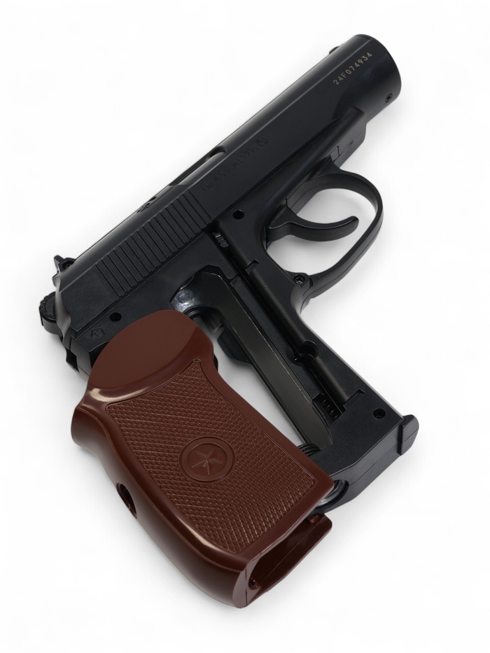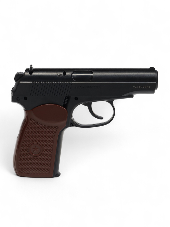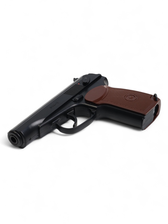 На вылете пуля набирает скорость до 100 м/с, при этом показатель дульной энергии пистолета Borner PM-X не превышает 3 Дж, поэтому приобрести его могут все желающие, без необходимости оформления разрешений и лицензий. Внешний вид пистолета также соответствует боевому прототипу в его классическом исполнении – корпус окрашен в черный цвет, на рукоятке пластиковая коричневая накладка с рифлением и пятиконечной звездой в центре.