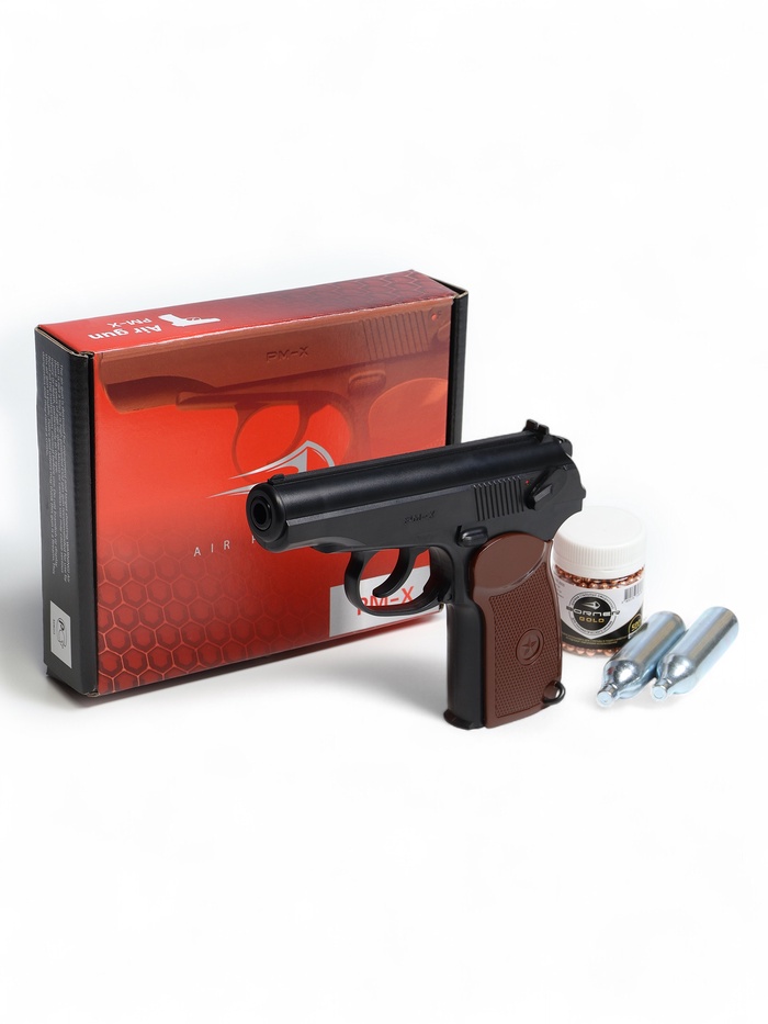 Пневматический пистолет Borner PM-X – это копия прославленного Макарова, предназначенная для тренировок начинающих стрелков и развлекательной стрельбы. Модификация является газобаллонной пневматикой, энергию пуле сообщает баллончик с углекислотой массой 12 грамм. Боеприпасы для этого пистолета – это шарики диаметром 4,5 мм, количество шариков в магазине – 16 единиц.
