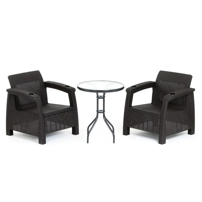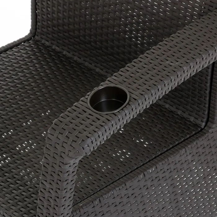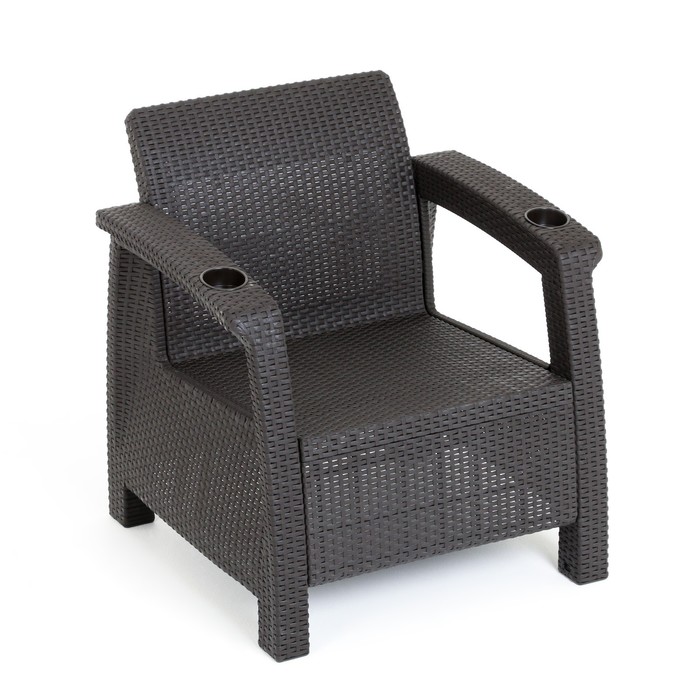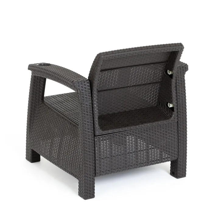 Кресло произведено из высококачественного полипропилена, имитирующего плетение из ротанга.