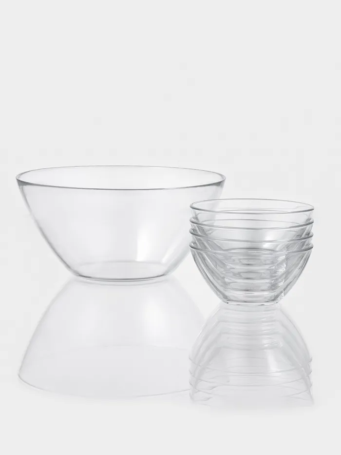 Порядок и стиль на вашем столе! Набор салатников – это пять прозрачных стеклянных емкостей, подходящих для подачи, хранения и приготовления.