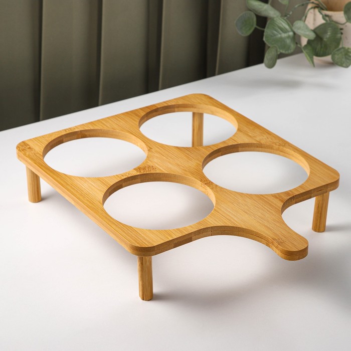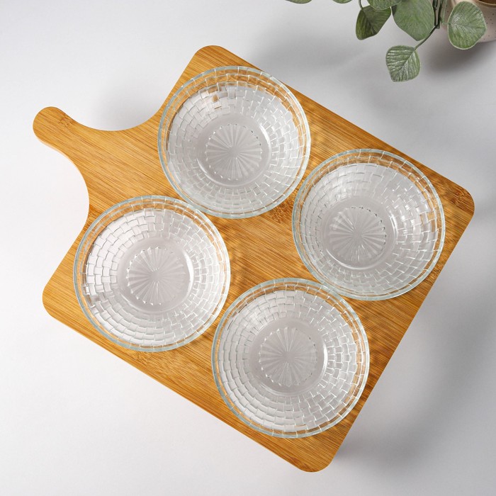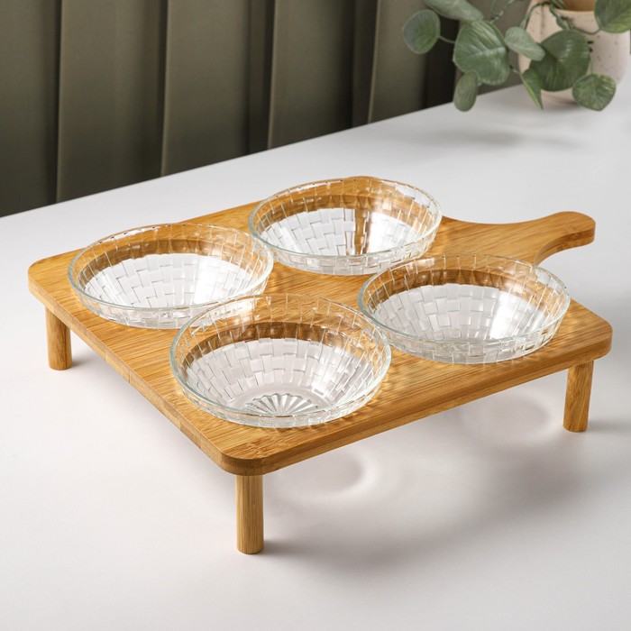 Набор для подачи «Ронда» изготовлен из качественных и экологичных материалов: стекла и бамбука. Набор имеет четыре отдельные ёмкости, которые можно использовать как салатники и бамбуковую подставку. Такая посуда легко впишется в праздничную сервировку и позволит интересно подать закуски на стол. Набор для подачи подойдёт для проведения вечеринок или домашних посиделок с близкими. В такие ёмкости можно положить нарезку сыра, фрукты, мясные деликатесы, орехи, конфеты и прочие продукты.