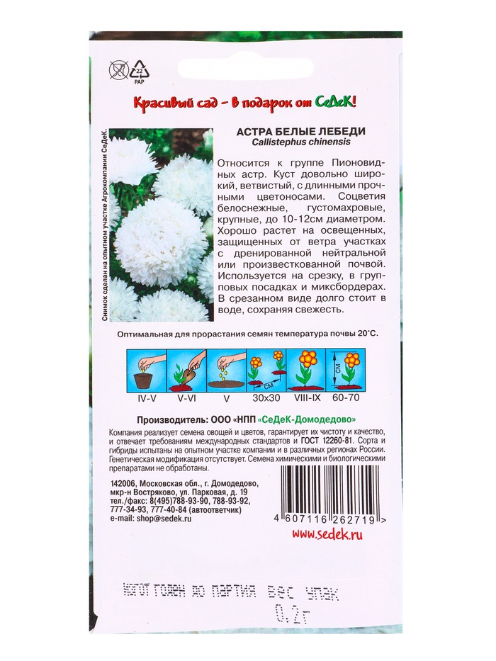 Набор семян Астра "Белые лебеди "0.2 г, 5 шт. — Характеристики