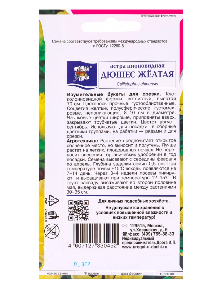 Набор семян Астра пионовидная "Дюшес", желтая, 5 шт. — Характеристики