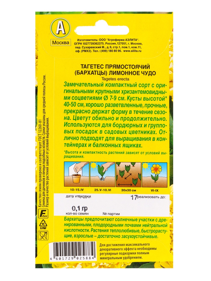 Набор семян Бархатцы "Лимонное чудо" прямостоячие, О, 5 шт. — Характеристики