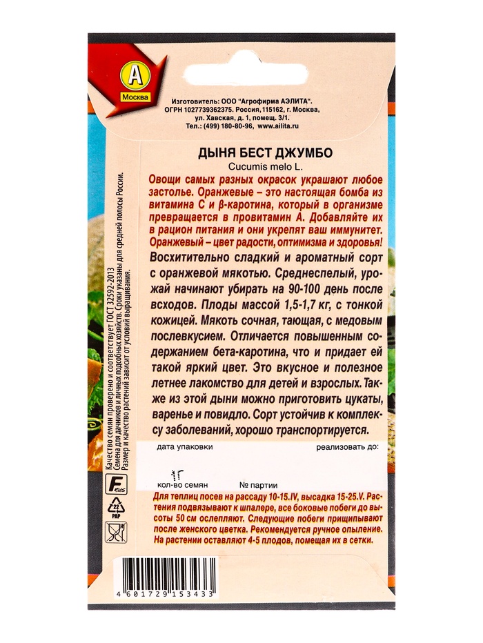 Набор семян Дыня "Бест Джумбо", 5 шт. — Характеристики