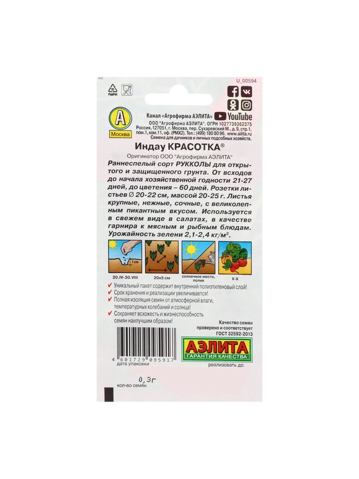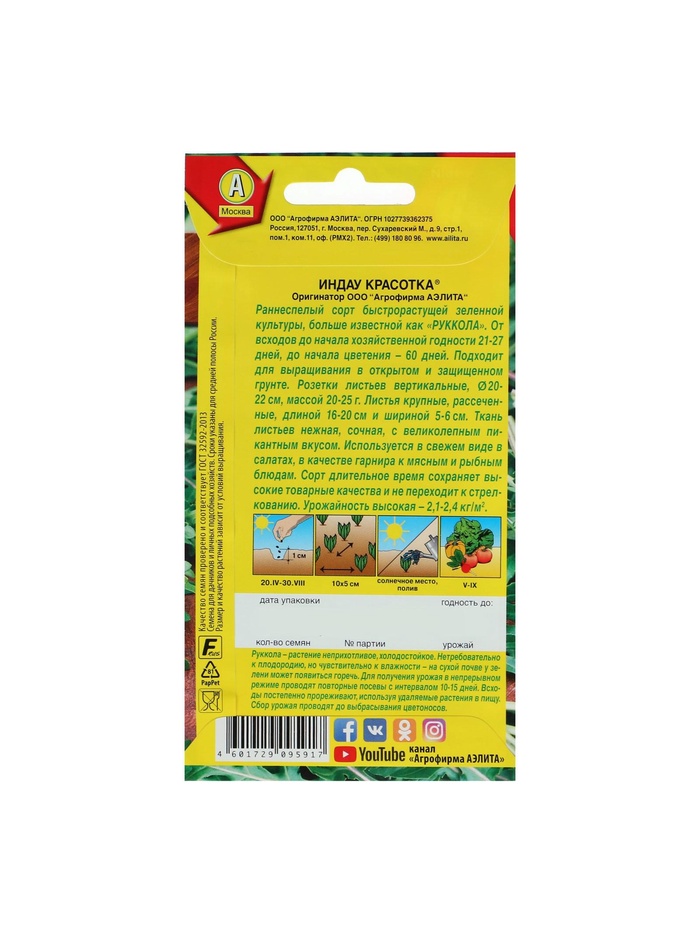 Набор семян Индау (Руккола) "Красотка", 5 шт. — Характеристики