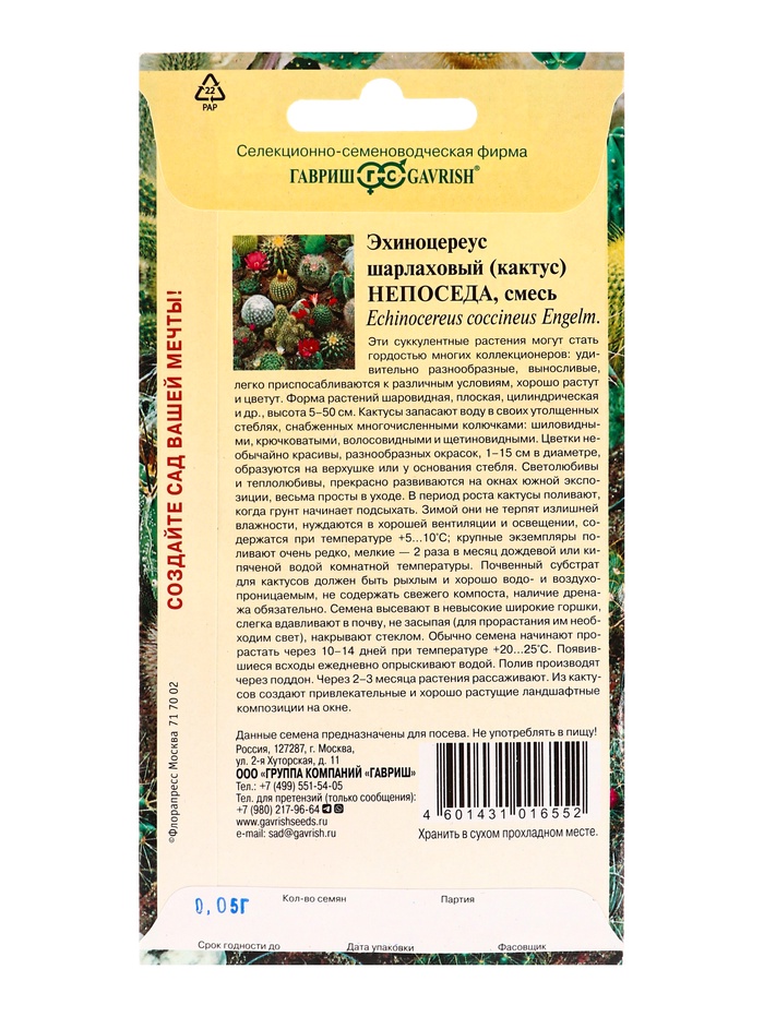 Семена комнатных цветов Кактус "Непоседа", ц/п, 0,05 г
