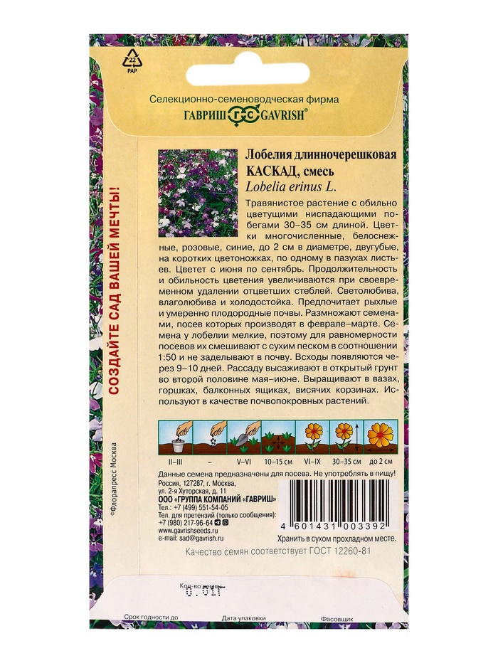 Набор семян Лобелия "Каскад", ампельная, О, 5 шт. — Характеристики