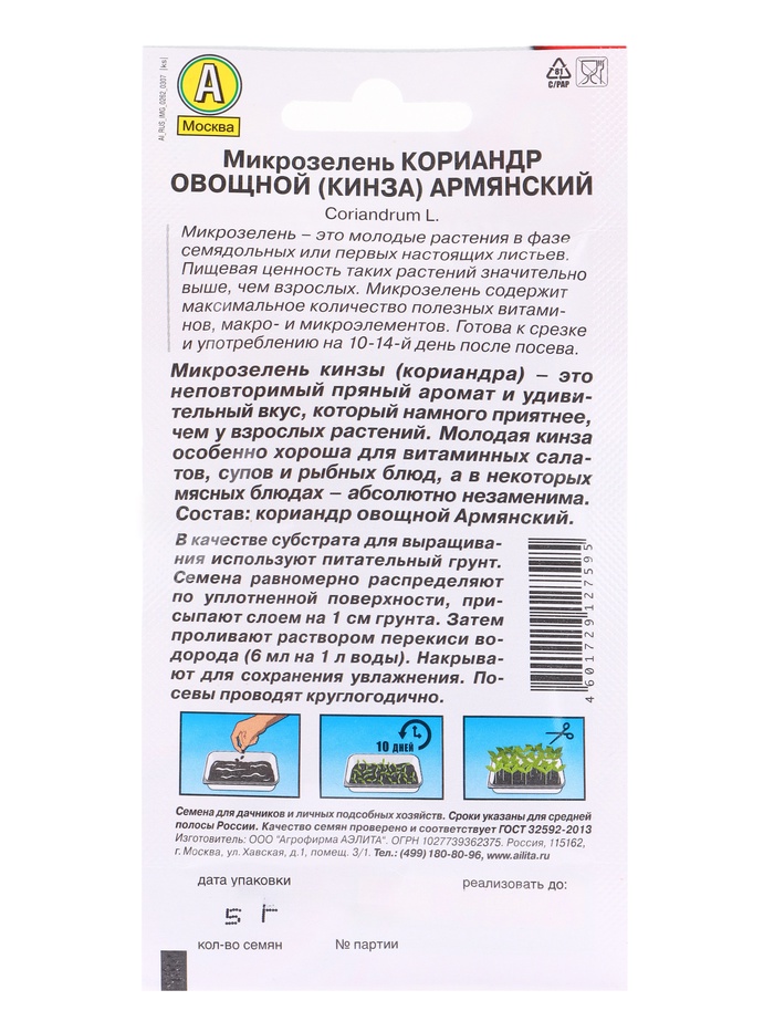Набор семян Микрозелень Кинза, 5 шт. — Характеристики