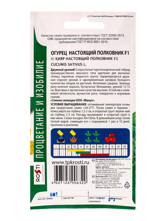 Набор семян Огурец Настоящий полковник F1, ранний, партенокарпический, 5 шт. — Характеристики