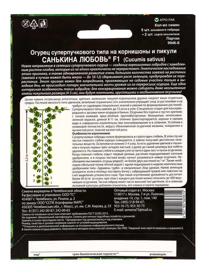 Набор семян Огурец "Санькина Любовь" F1 супербукетный тип, партенокарпический, 3 шт.
